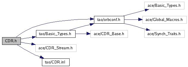 #include "tao/orbconf.h"#include "tao/Basic_Types.h"#include "ace/CDR_Stream.h"#include "tao/CDR.inl"Include dependency graph for CDR.h: