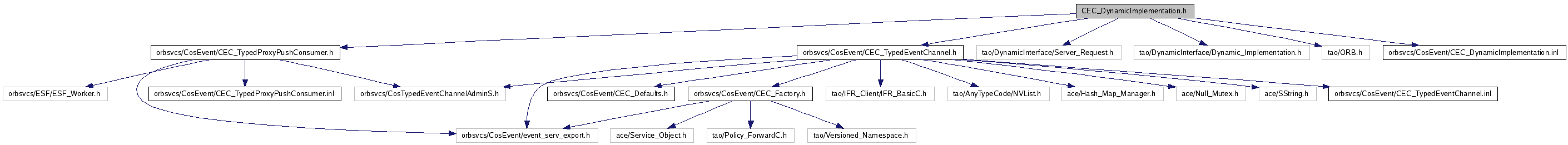 #include "orbsvcs/CosEvent/CEC_TypedProxyPushConsumer.h"#include "orbsvcs/CosEvent/CEC_TypedEventChannel.h"#include "tao/DynamicInterface/Server_Request.h"#include "tao/DynamicInterface/Dynamic_Implementation.h"#include "tao/ORB.h"#include "orbsvcs/CosEvent/CEC_DynamicImplementation.inl"