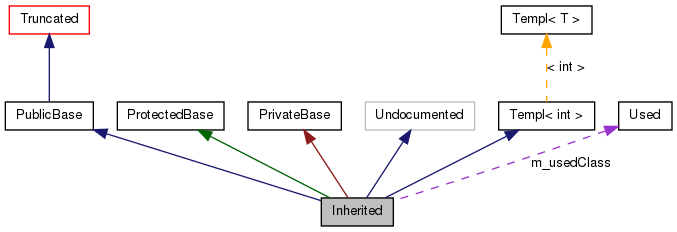 /*! Invisible class because of truncation */ class Invisible { }; /*! Truncated class, inheritance relation is hidden */ class Truncated : public Invisible { }; /* Class not documented with doxygen comments */ class Undocumented { }; /*! Class that is inherited using public inheritance */ class PublicBase : public Truncated { }; /*! A template class */ template<class T> class Templ { }; /*! Class that is inherited using protected inheritance */ class ProtectedBase { }; /*! Class that is inherited using private inheritance */ class PrivateBase { }; /*! Class that is used by the Inherited class */ class Used { }; /*! Super class that inherits a number of other classes */ class Inherited : public PublicBase, protected ProtectedBase, private PrivateBase, public Undocumented, public Templ<int> { private: Used *m_usedClass; };