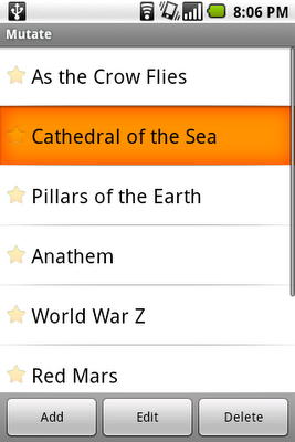 application with a list of books. Each book has a star next to its name, totally